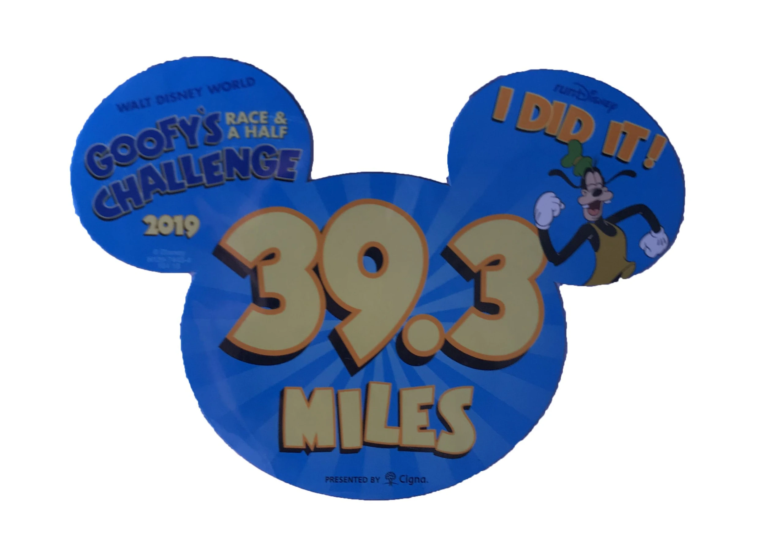 Training for a runDisney marathon event requires a lot of stickability, so it’s appropriate to celebrate with this 2019 Goofy Challenge magnet, and show how you did 39.3 miles.