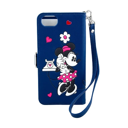 Minnie chatting on a corded phone. A faux leather flip-open case holds