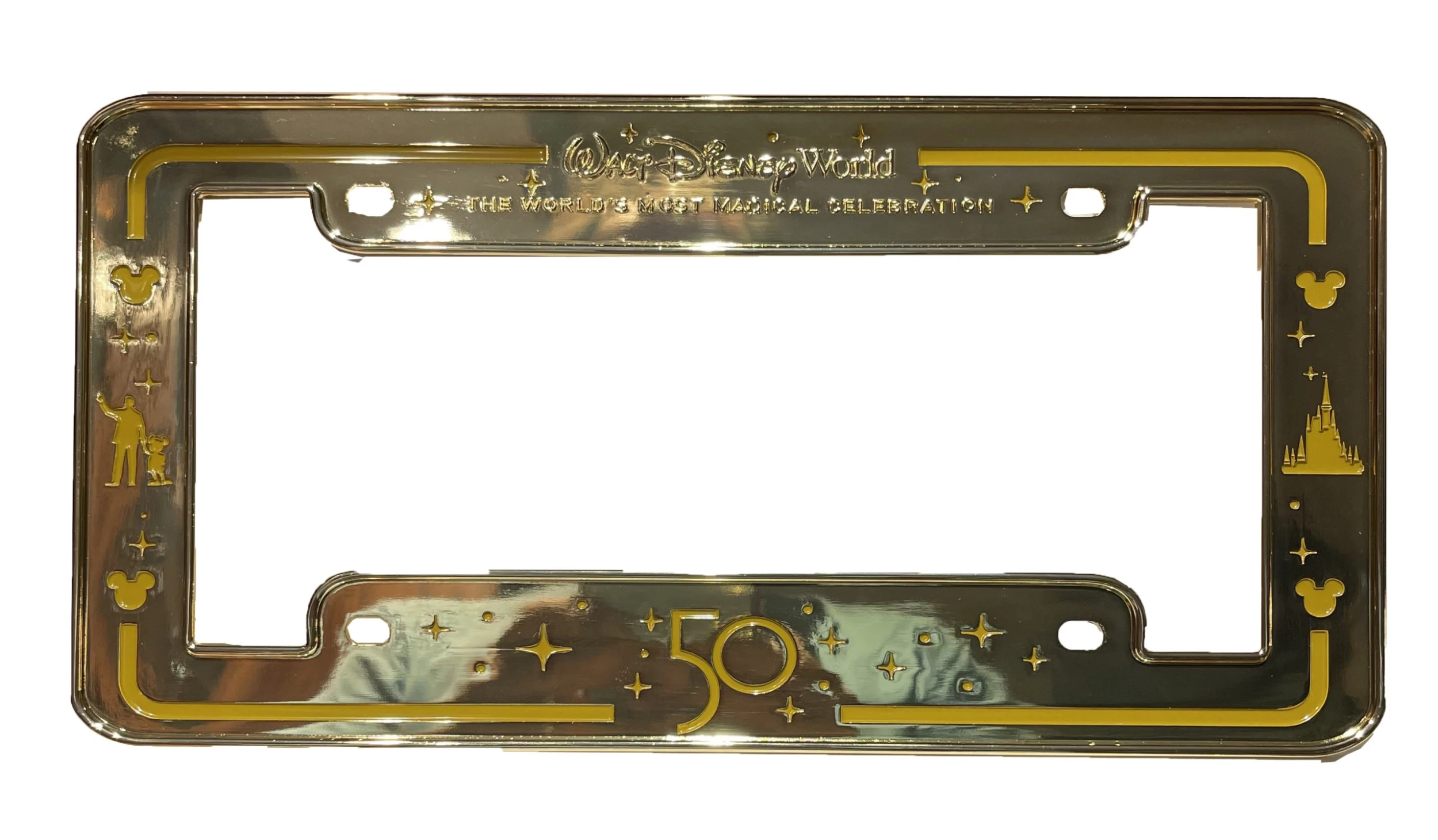 Proudly celebrate Walt Disney World 50th Anniversary everywhere you go with the exclusive Metal License Plate Frame with Walt and Mickey with “50”