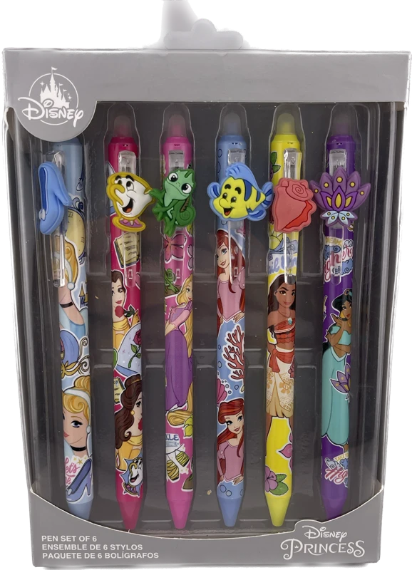These Princesses are up to the task with this set of six retractable ballpoint pens with clip on charms.