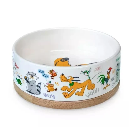 With the promise of food, it’s not surprising there’s a whole collection of Disney critters hanging around this pet bowl. Meeko, Percy and Little Brother are among the creatures featured on the outside while an excited Pluto is pictured on the inside of this ceramic dish that has a decorative wooden base!